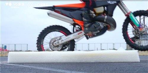 最具冲击力的测试之一,当属“极限飞车挑战”和“集装箱4米高空自由落体破坏性测试”。数吨重的货柜从几米高的高空中重重砸下,6D蜂巢芯产品未出现塌陷或结构破坏。在摩托车飞跃碾压下,卸压后秒回弹,床垫表面依旧保持平整。6D蜂巢芯仿生蜂巢结构构建的稳定空间桁架结构,设计承载能力高达39kN,独特的几何构型可分散应力,确保在受压与回弹过程中保持力学响应稳定,直观验证高支撑、不塌陷的产品质量。