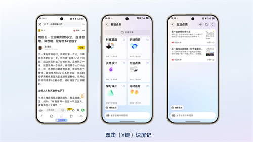 日常刷到的出游攻略、穿搭笔记、生活技巧,随手收藏或截图后,往往陷入“收藏即吃灰”的窘境——内容杂乱难查找,优质干货白白浪费。在华为畅享90系列上,无需中断浏览,双击X键即可让小艺帮记自动识别当前屏幕内容(如攻略、笔记、穿搭贴士)并一键保存至智能合集。小艺帮记会自动归类整理,让用户更高效地查找、回顾和管理自己的个人数据。同时,用户也可根据自身需求灵活调整,比如将穿搭笔记、生活技巧等自动归为一类,逐步构建自己的知识体系。